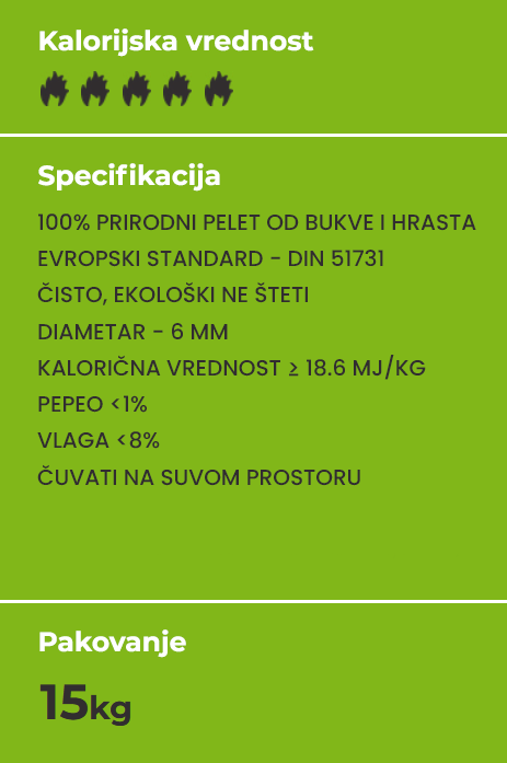 U odnosu na najkvalitetniju vrstu uglja, drveni pelet je jednak sa cenom ali uz daleko veći komfor. Isporučuje se u vrećama od 15 kg i u velikim jumbo vrećama od 1000 kg.